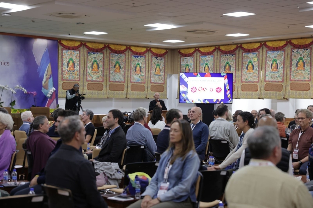 Of course this non-separation has been one of the central teachings His Holiness has offered throughout his life. In all past Dialogues, His Holiness was physically present every day, at the very heart of the conversations with scientists and philosophers. This year, we felt his absence—and at the same time, he was present through the monastics who carry forward his legacy, such as His Eminence Khangser Rinpoche, Geshe Lodoe Sangpo, Geshe Thabkhe, and Venerable Ani Choyang. It was such an honor to receive their compassionate wisdom on this year’s theme. And meeting His Holiness on the final day, we sensed that he had been with us the whole time.