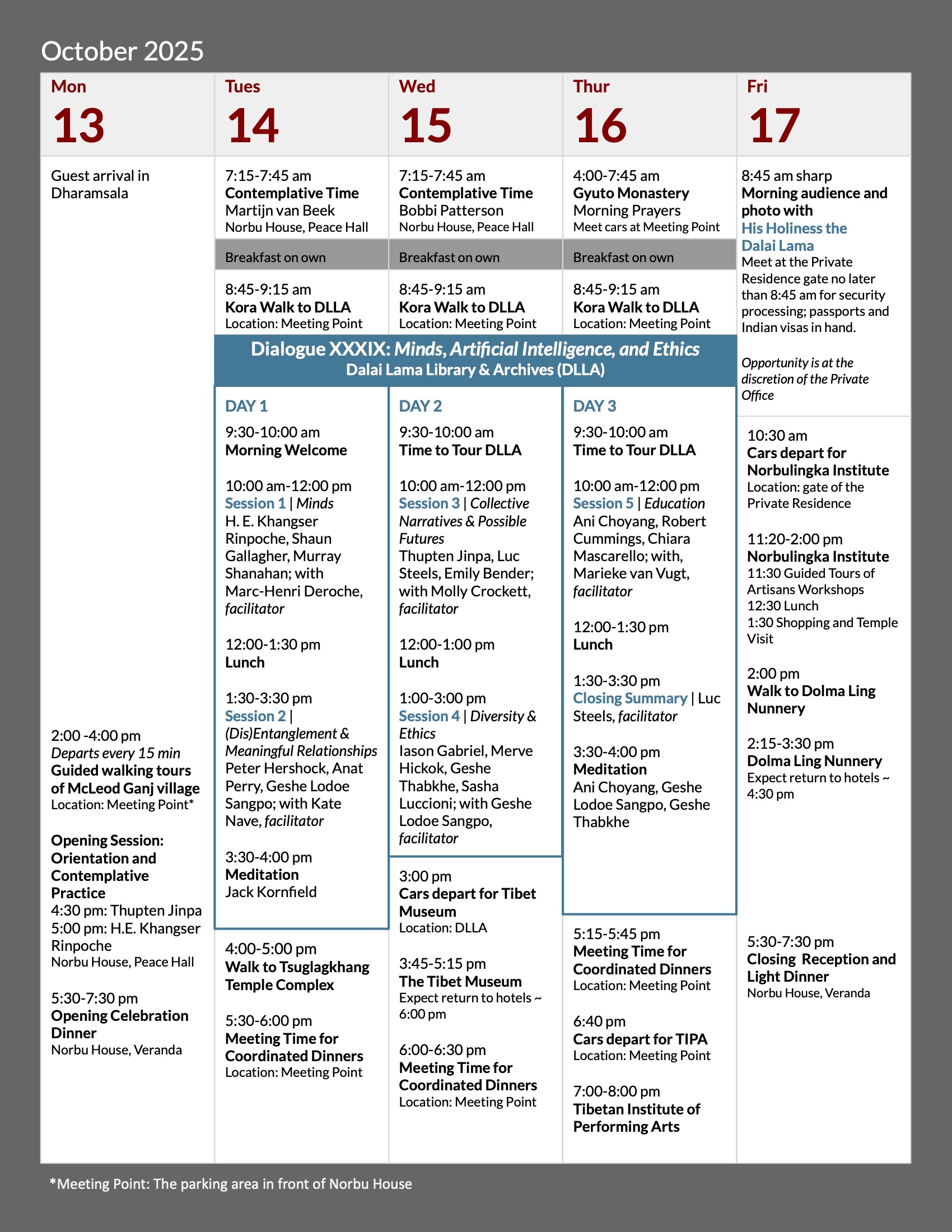 You will need to provide a copy of your visa, your passport’s photo page, and your photo to the Mind & Life Institute for purposes of your security badge, required by the Office of His Holiness the Dalai Lama. The photo must be square, forward facing, and cropped close to your face. It does not have to be an official passport photo. Secure upload instructions will be provided. Deadline for submitting your security documents is July 7, 2025.