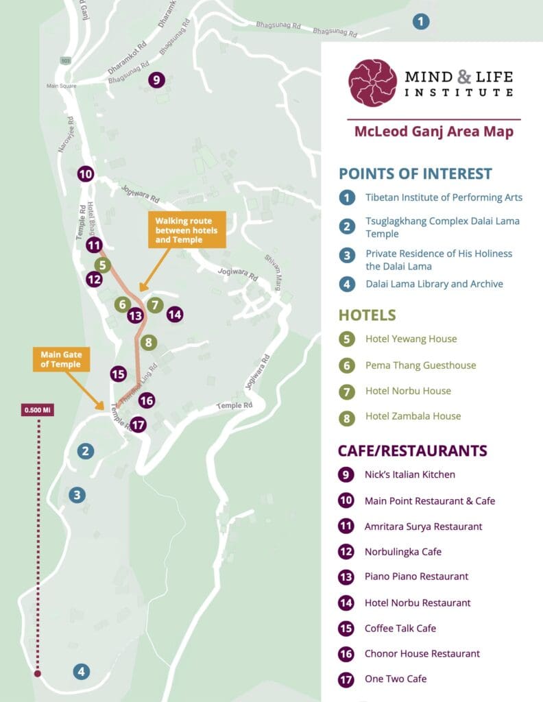 Mind & Life Institute staff will make arrangements to meet you upon landing in Delhi,* provide airport ground transportation in Delhi and Dharamsala,** and organize all group activities and meals with your safety and comfort in mind.